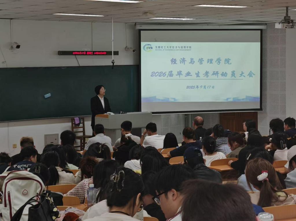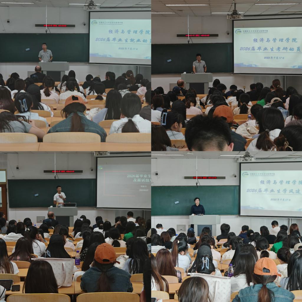 为全面加强学风建设、引导毕业年级学生明确努力方向、树立正确的就业观,9月17日,经济与管理学院在通明楼338教室召开2026届毕业生年级大会。学院党委书记李丙文、院长王蓉、党委副书记关婷、工程管理教研室主任边晶梅、2025级辅导员刘伟、研究生辅导员郑烁今以及2026届全体毕业生参会。大会由2026届毕业生辅导员齐伟主持。
