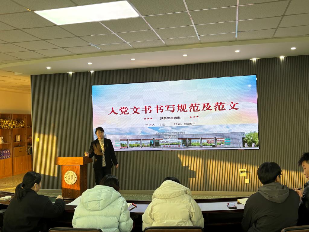 2025年11月19日,经济与管理学院在通明楼311报告厅顺利开展2025年秋季学生党员培训。本次培训聚焦预备党员转正关键环节,学院组织员信莹以“入党文书书写规范及要求”为题讲专题党课,学院全体预备党员参加培训。